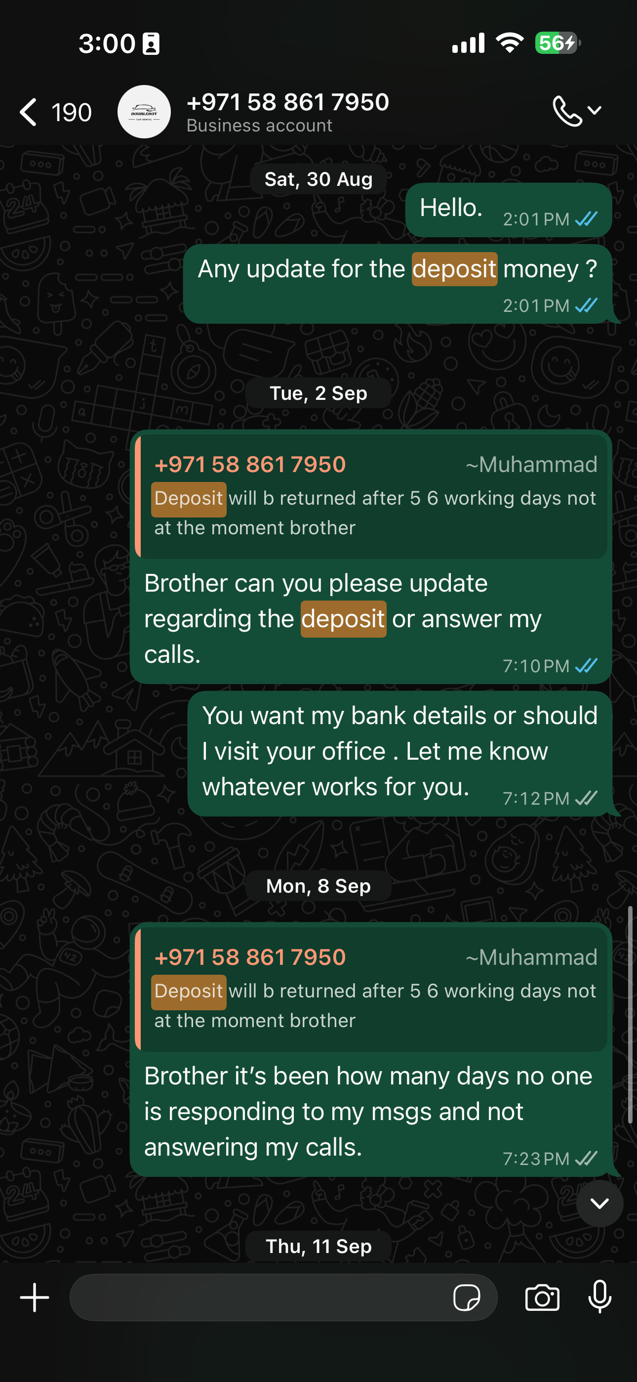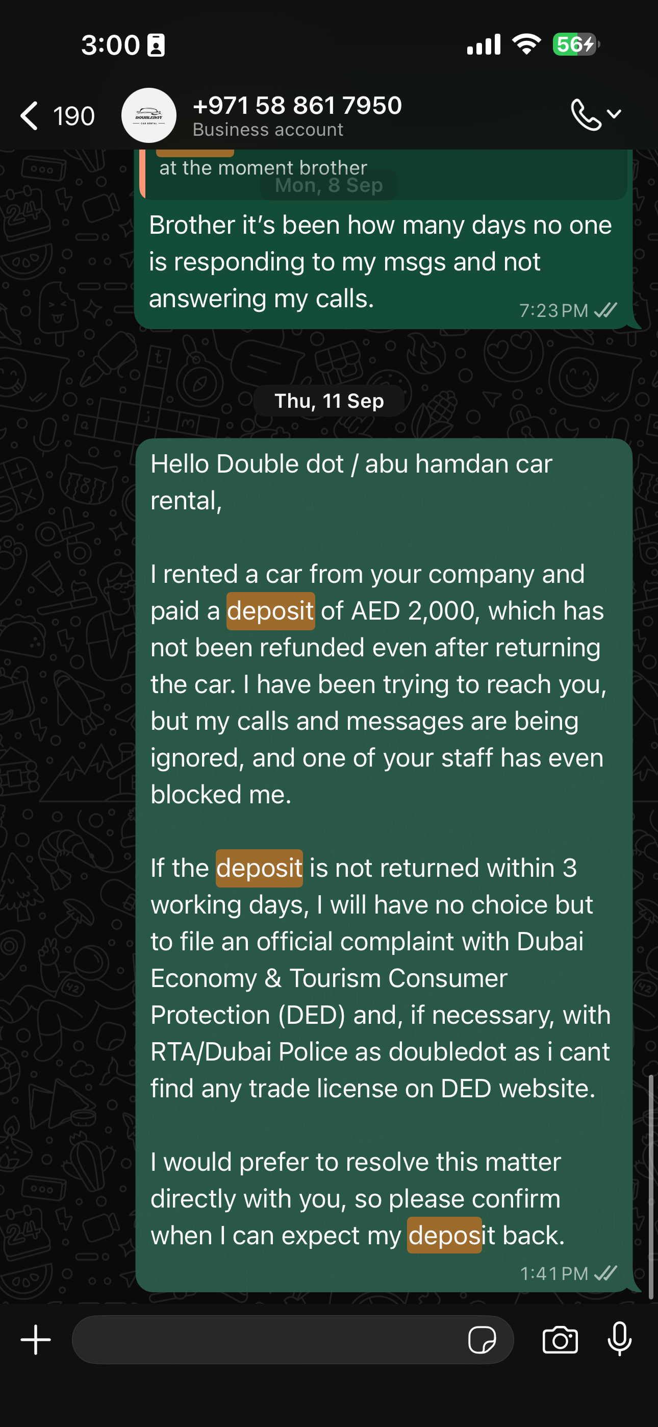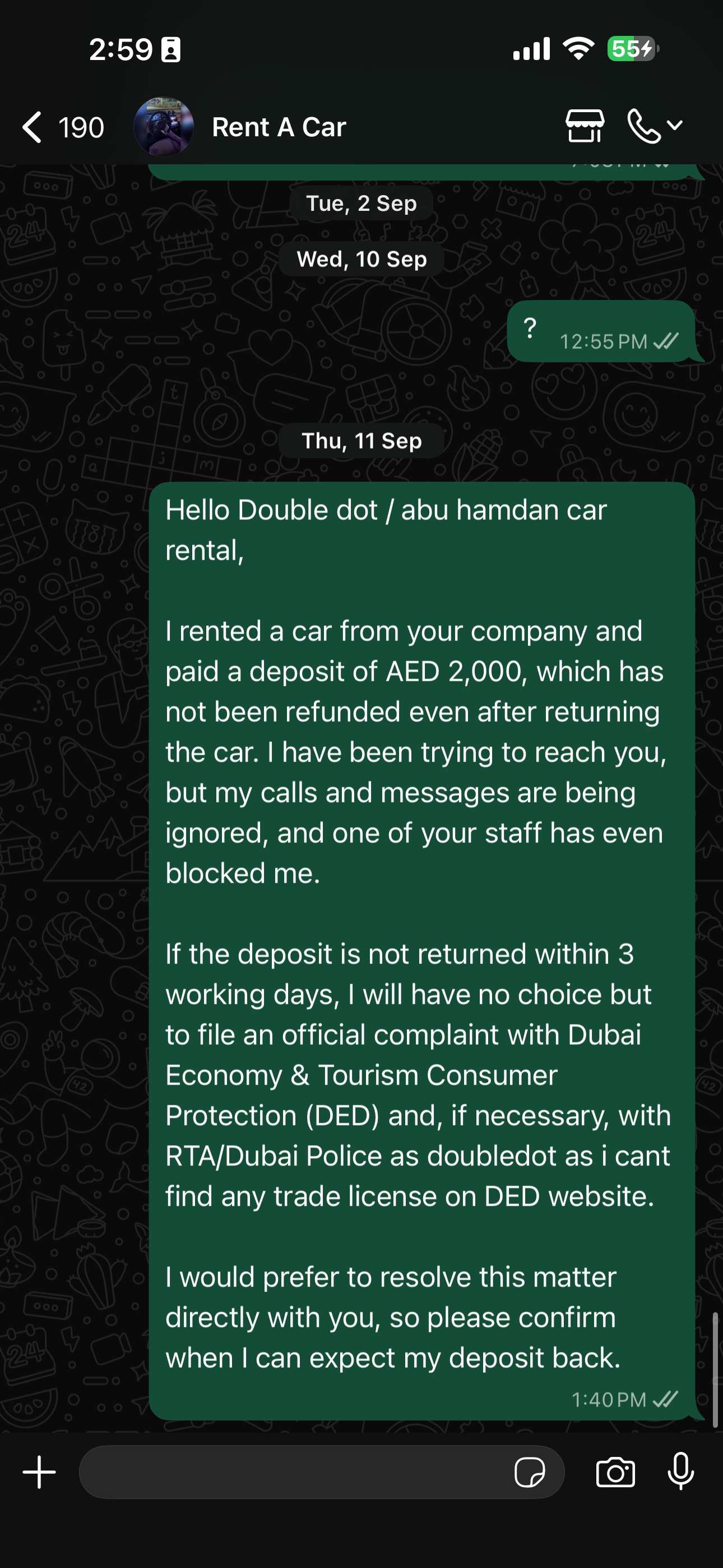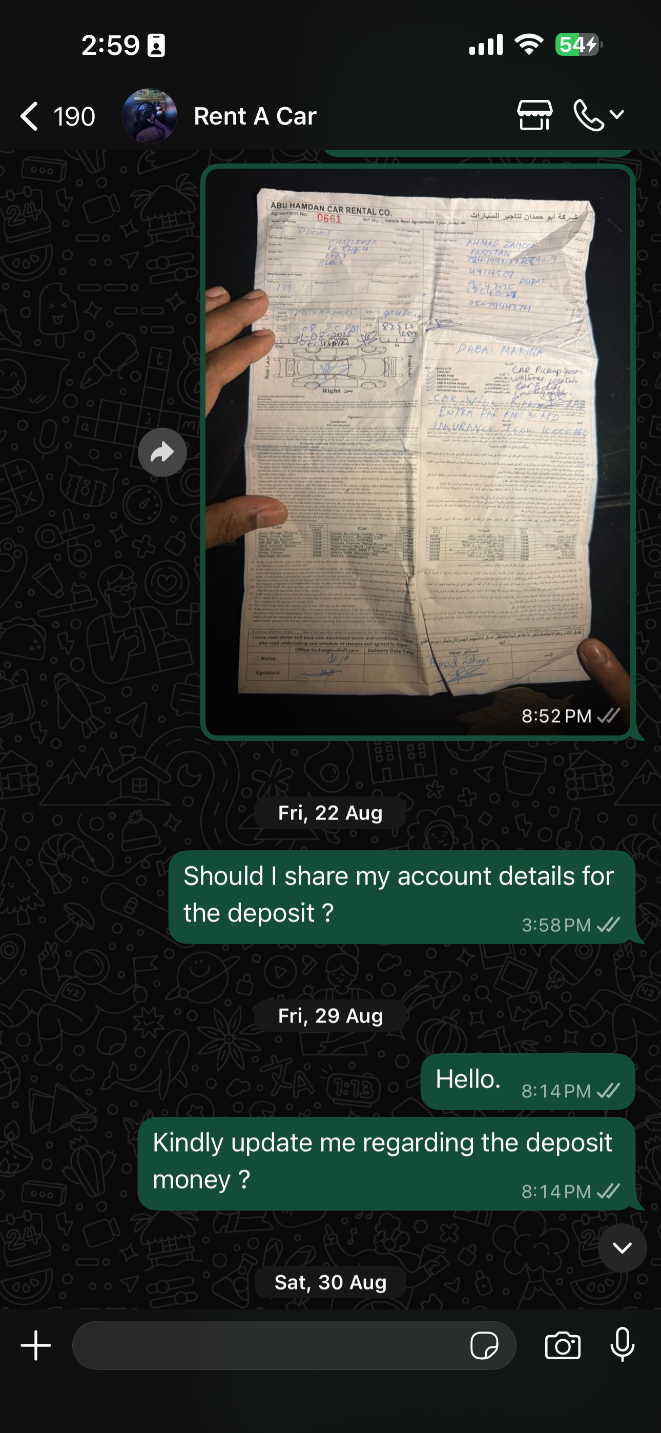 I rented a car from Abu hamdan car rental on 20th august. I paid a refundable deposit of AED 2,000, which was supposed to be returned after the car was returned. Despite returning the car in perfect condition, the company has not refunded my deposit.