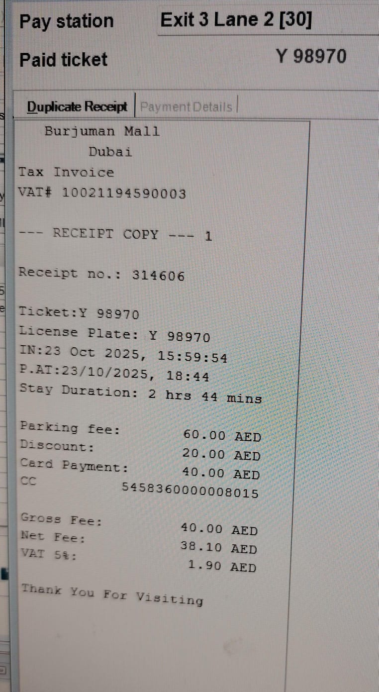 October 23, 2025 I park my car at burjuman parking stay duration 2 hours 44 mins they collected money AED 40. Burjuman telling 3 hrs. Free for shoppers, I bring out my car