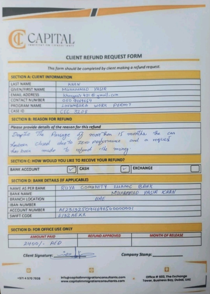 The company ( Capital Immigration services) had received an advance payment of Dh2,400 for a Shanghai visa a year and a half ago, but to date, despite repeated request for a refund, the payment has not been made.